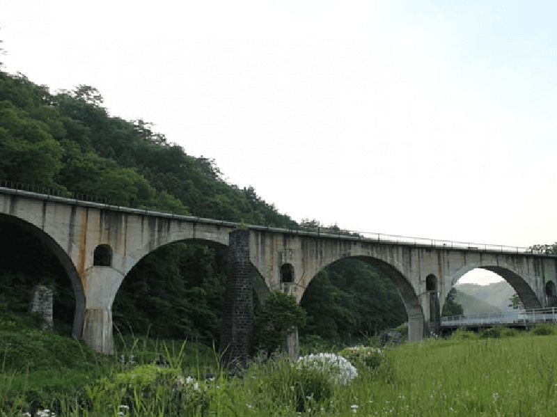 JR釜石線が通っており、半円が五つ連なるアーチ型の橋がレトロで、おしゃれな雰囲気です。