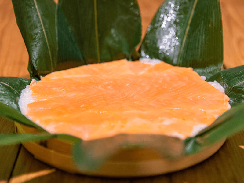 ほど良く脂がのった桜鱒(さくらます)を発酵させずに酢で味付けした押し寿司で、笹の葉を敷いたわっぱと呼ばれる木製容器に入っています。
