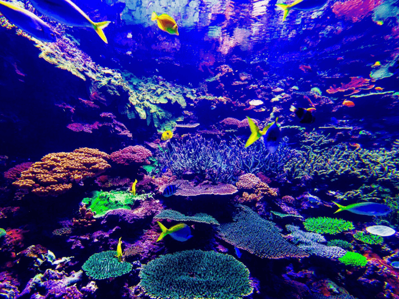 オーシャンゾーンの水槽を近くで見ると、さまざまな種類の魚が泳いでいるのを確認できます。