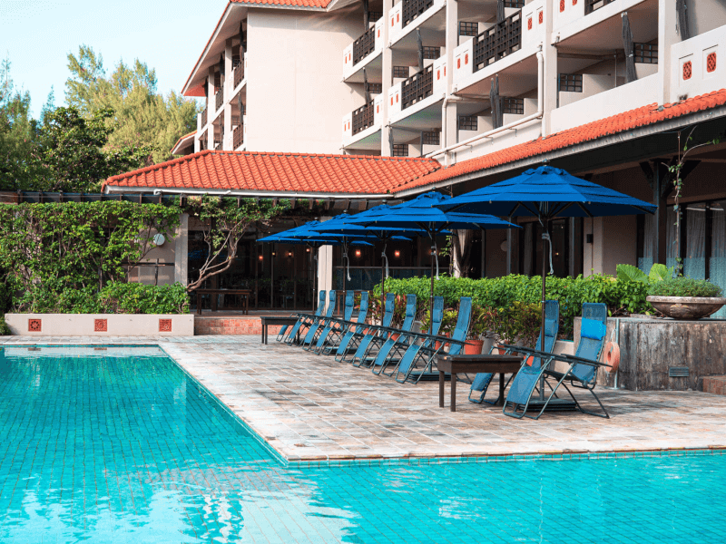 プールサイドのデッキチェアで休むのも気持ちのいい時間です。